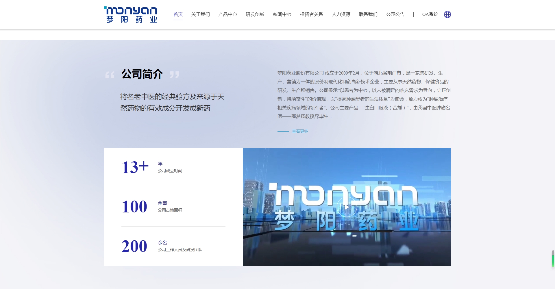夢陽藥業股份有限公司 成立于2009年2月,位于湖北省荊門市,是一家集研發、生產、營銷為一體的股份制現代化制藥高新技術企業,主要從事天然藥物、保健食品的研發、生產和銷售。 公司秉承“以患者為中心,以未被滿足的臨床需求為導向,守正創新,持續奮斗”的價值觀,以“提高腫瘤患者的生活質量”為使命,致力成為“腫瘤治療相關疾病領域的領軍者”。
